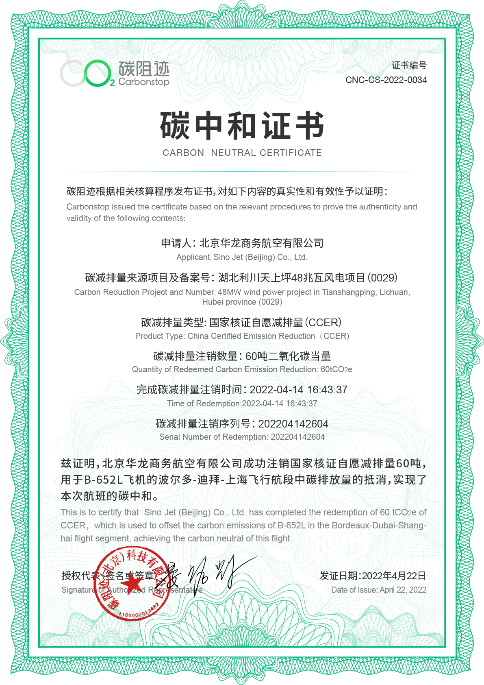 4月22日,世界地球日,华龙航空宣布从法国引进一架自有的达索猎鹰7X公务机,并通过采取低碳减排举措以及注销国家核证自愿减排量的方式,实现整个引进飞行过程的“碳中和”。这是中国公务机领域的首次“碳中和”飞行,将积极推动公务机企业低碳转型、助力中国公务航空业在环保减碳方面的探索与实践。